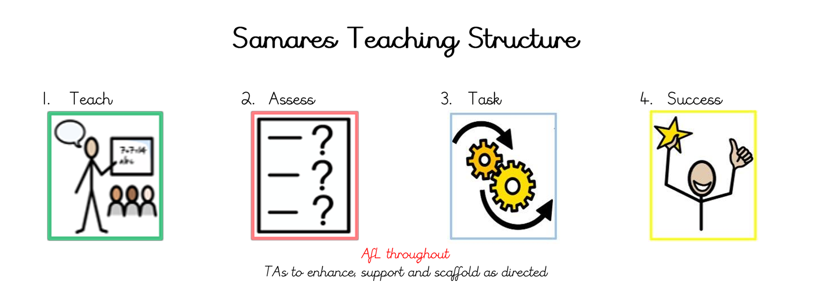 At Samares, we have developed a structured four-part lesson model (Teach, Assess, Task, Success) grounded in educational research to support staff in planning and delivering high-quality lessons. This framework ensures that lessons are purposeful and consistent, aligning closely with our teaching and learning policy. By embedding this model into daily practice, we promote a shared approach to teaching that enhances student outcomes and supports professional growth across the school.