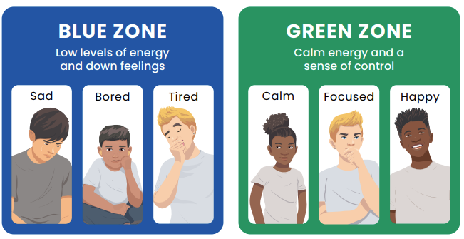 We refer to coloured zones to describe how a child may be feeling at a given time. It is never wrong to be in a given zone - it is how we learn to manage ourselves in this zone that matters.